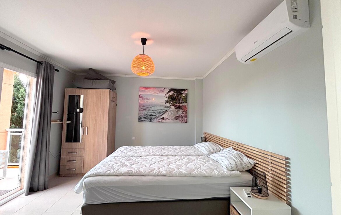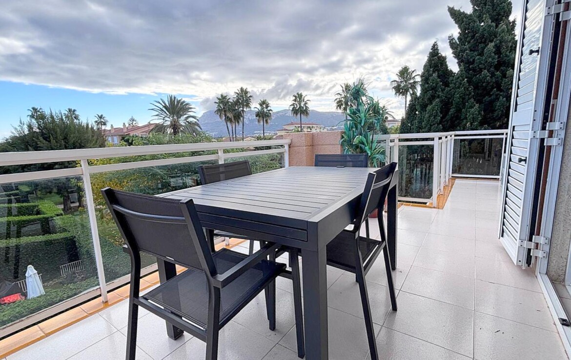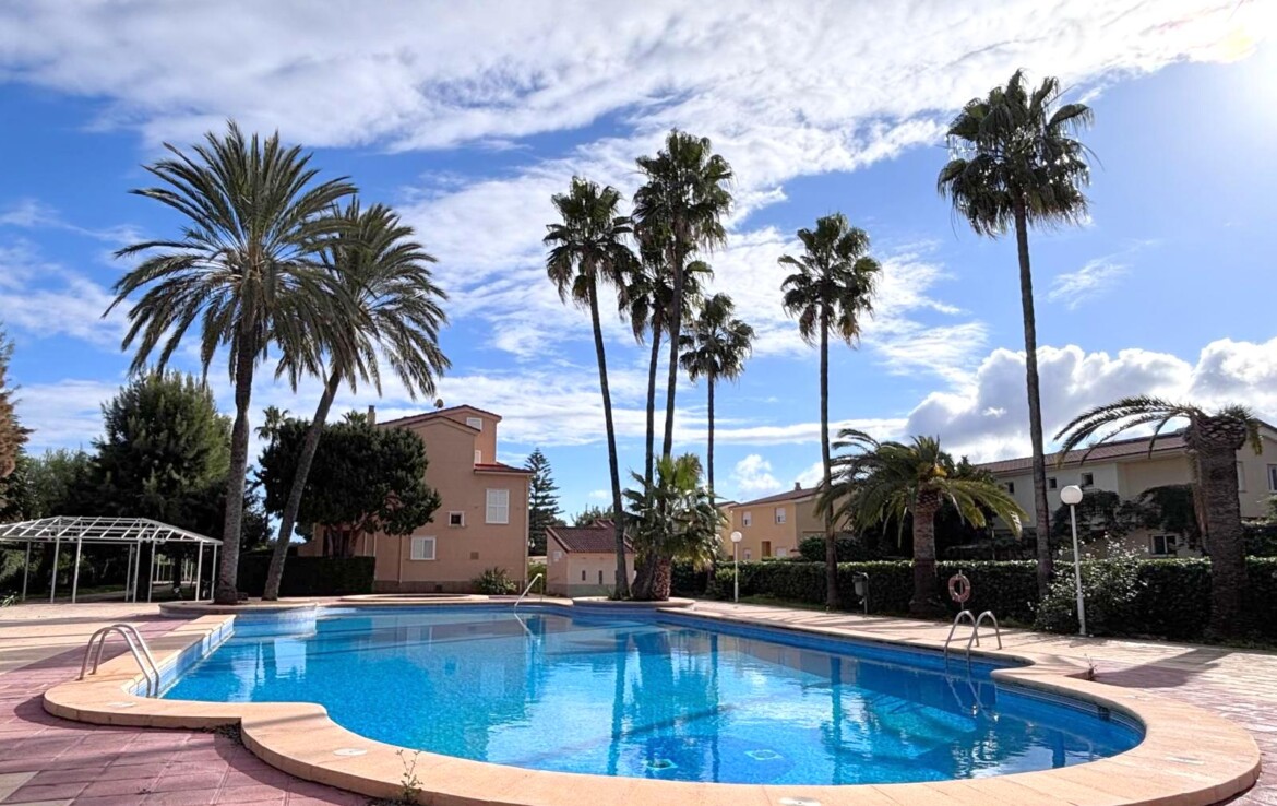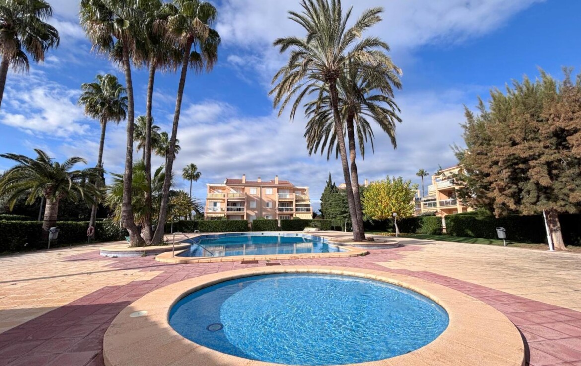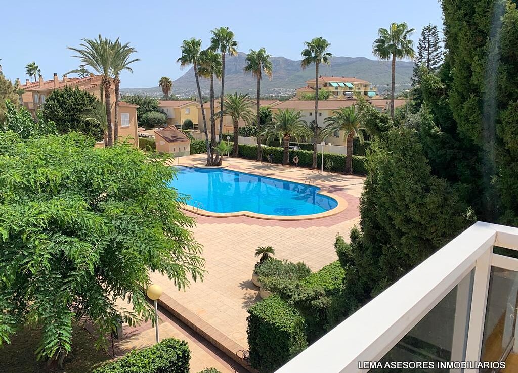 Piso con 105 m2, 2ª planta sin ascensor. Distribución: Amplio salón/ comedor con acceso a una terraza soleada y bonitas vistas (piscina y Montgó). Cocina integrada al salón (amueblada y equipada con los principales electrodomésticos). 3 habitaciones dobles con aire acondicionado frio/calor. Urbanización muy cuidada con amplios jardines y gran piscina comunitaria al aire libre. Plaza de garaje incluida en el precio.